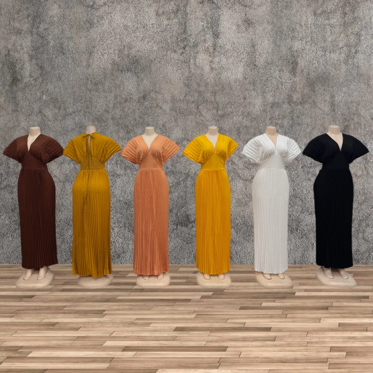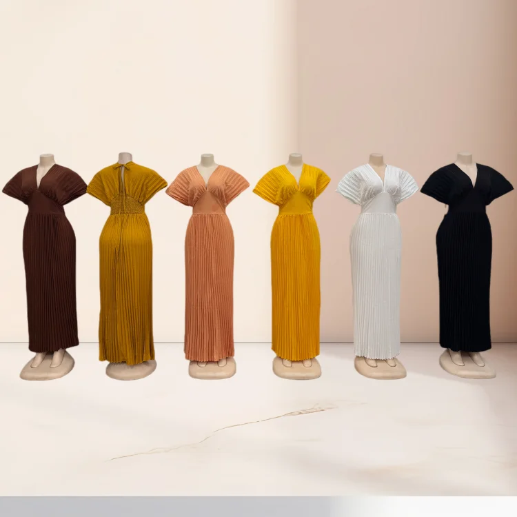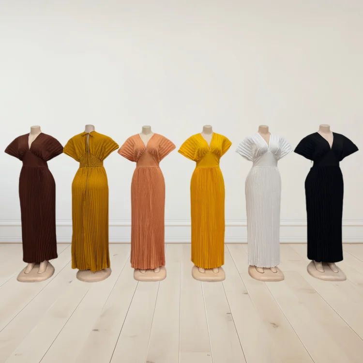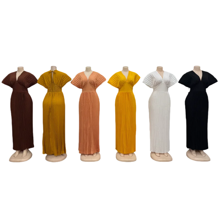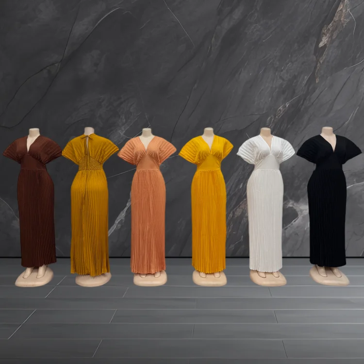 Women's Elegant Pleated V-neck High Waist A- Line Casual Spring New Solid Color Dress